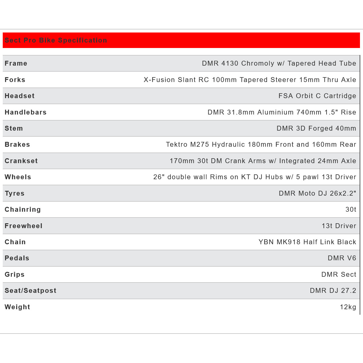 Technical details of the DMR Sect Pro 26″ Dirt Jump Bike